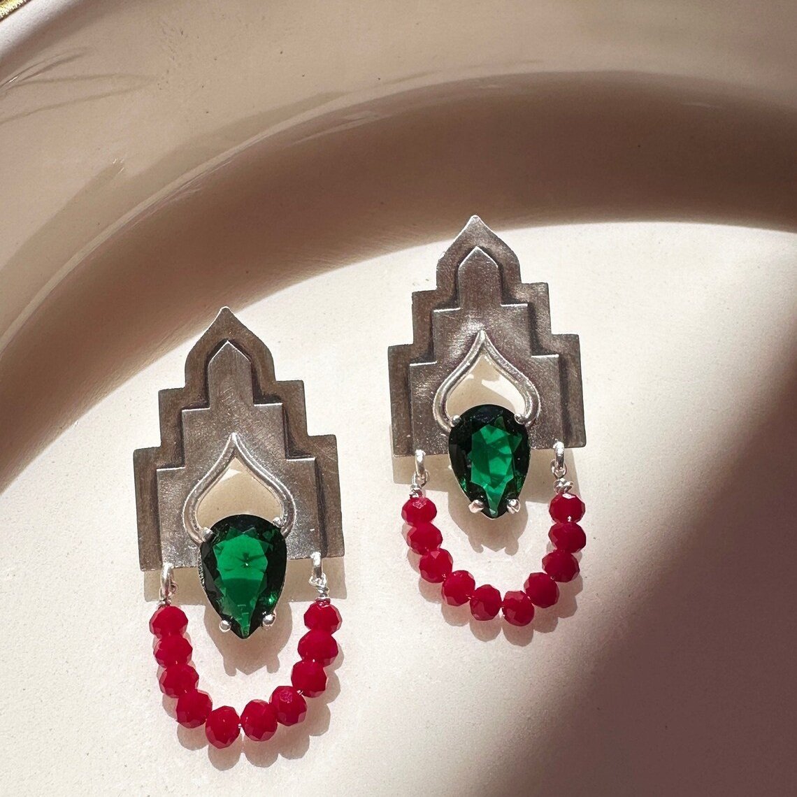 Architectural Sterling Silver Earrings with Green Teardrop Gem, Gothic Arch Inspired, Unique Statement Handmade Jewelry for Women