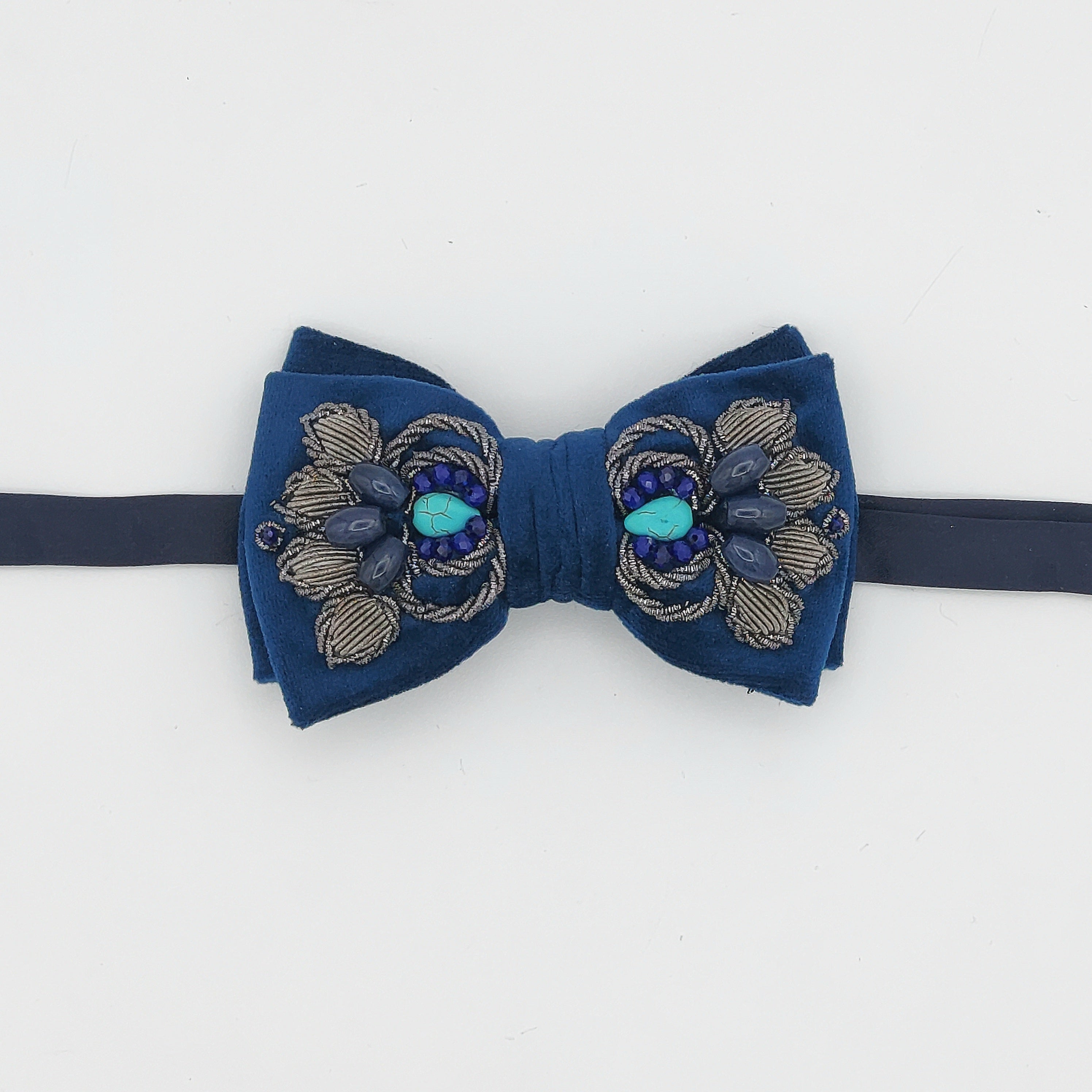 The exquisite Nader Bowtie, a masterpiece by Noorarash Designs, is a handmade dark blue velvet bow tie, adorned with intricate Sermeh embroidery, Turquoise and Blue Jade. This bow tie showcases traditional craftsmanship merged with contemporary elegance. The adjustable ribbon and clasp closure ensures a perfect fit for any occasion, allowing you to customize the length to suit your personal style.