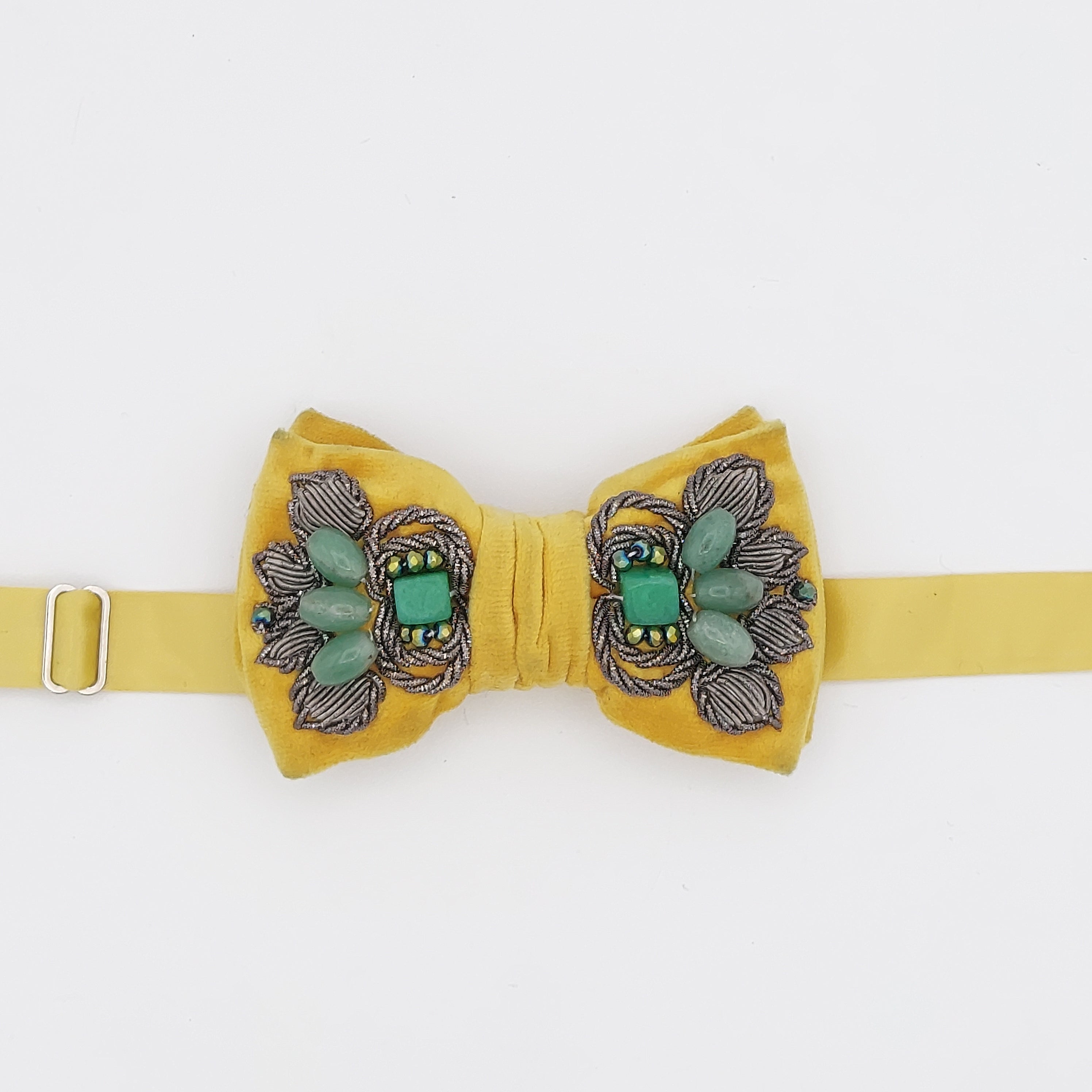 The exquisite Nader Bowtie, a masterpiece by Noorarash Designs, is a handmade yellow velvet bow tie, adorned with intricate Sermeh embroidery, Jade, and Aquamarine stones. This bow tie showcases traditional craftsmanship merged with contemporary elegance. The adjustable ribbon and clasp closure ensures a perfect fit for any occasion, allowing you to customize the length to suit your personal style.